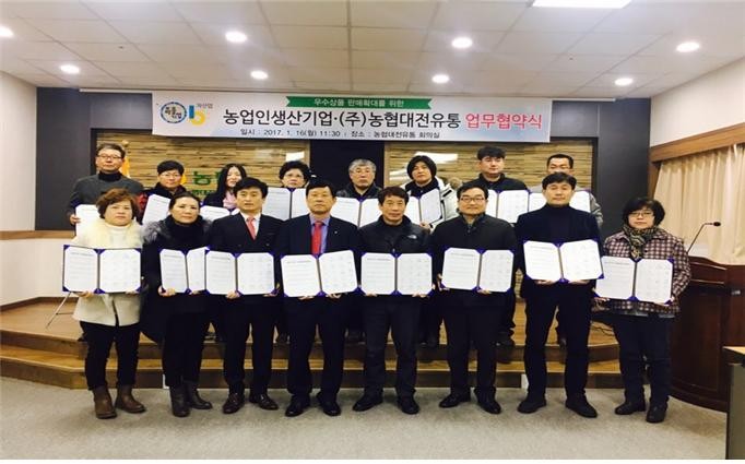 [로컬세계 오영균 기자]농협대전유통은 지난 16일 우리 지역 19개 농업인 생산기업이 ㈜농협유통 회의실에서 농업인 생산기업 제품 판매확대 및 농업인 소득증대를 위한 업무협약을 가졌다.