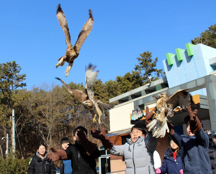 | ▲20일 경기도야생동물구조관리센터에서 학생들이 치료가 완료된 말똥가리를 직접 자연으로 돌려보내고 있다.(경기도 제공) |
