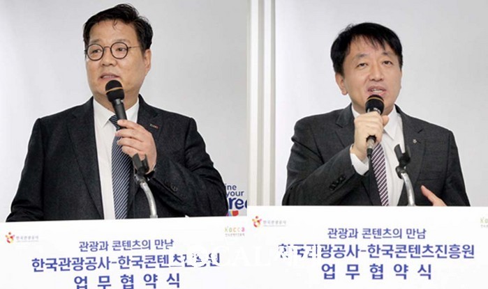 ▲19일 서울 중구 CKL 기업지원센터(한국관광공사 서울센터) 16층에서 열린 '한국콘텐츠진흥원-한국관광공사 업무협약식'에 한국콘텐츠진흥원 김영준 원장(왼쪽)과 한국관광공사 안영배 사장(오른쪽)이 인사말을 하고 있다. |