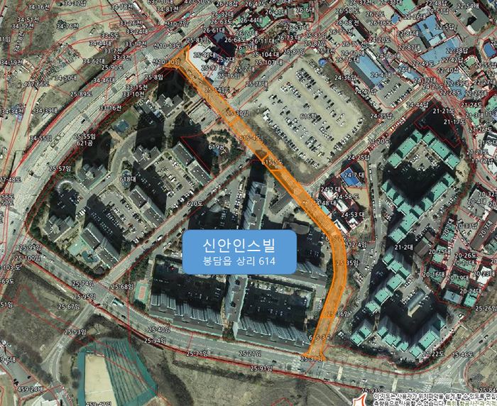 해당 토지는 봉담읍 소재 아파트에 진출입하는 공공시설(도로)로 면적은 4622㎡이며 공시지가는 약 12억원 상당이다.