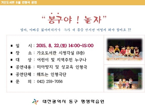 [로컬세계 조윤찬 기자] 대전 동구는 오는 22일 가오도서관내 8층 시청각실에서 인형극 ‘봉구야! 놀자’ 공연을 개최한다.