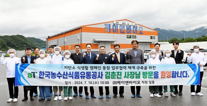 ▲농업회사법인 ㈜케이앤바이오 방문 현장사진. 김춘진 한국농수산식품유통공사 사장(우측 7번째), 백승한 케이앤바이오 대표(우측 8번째)aT 제공 |