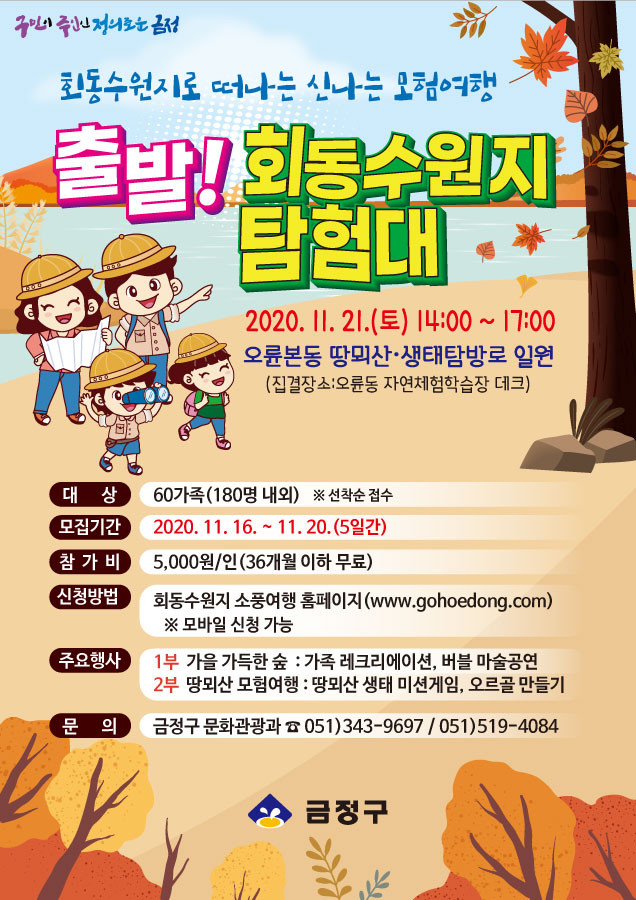 [로컬세계 맹화찬 기자]부산 금정구(구청장 정미영)는 오는 21일 회동수원지 일원에서 가족단위 신청자를 대상으로 하는 ‘회동수원지 소풍여행’의 두 번째 특별 프로그램 ‘출발! 회동수원지 탐험대’를 진행한다.