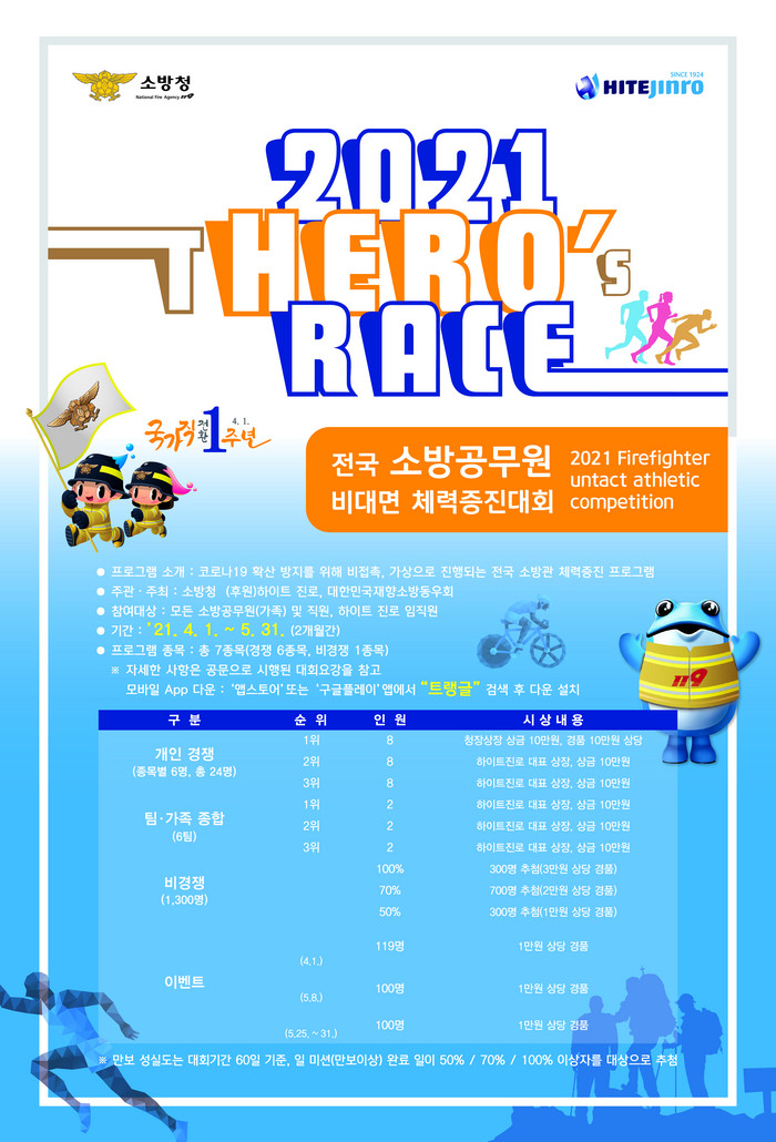 하이트진로(대표 김인규)는 소방청과 함께 비대면 체육대회 ‘2021 더 히어로 레이스(2021 the Hero’s Race)’를 개최한다고 24일 밝혔다. 하이트진로 임직원과 전국 소방공무원 직원 및 가족을 대상으로 4월 1일부터 2달간 진행한다.