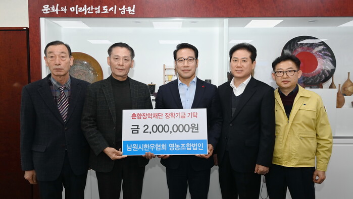 [로컬세계=이태술 기자]전북 남원시한우협회 영농조합법인에서는 지역 인재양성을 위한 장학기금 200만원을 춘향장학재단에 기탁했다.