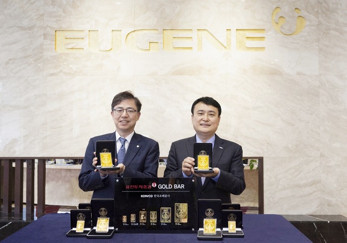 | ▲유진투자증권 박찬형 리테일영업본부장(왼쪽)과 한국조폐공사 문승훈 사업이사가 ‘오롯’골바를 들고 기념촬영을 하고 있다. |