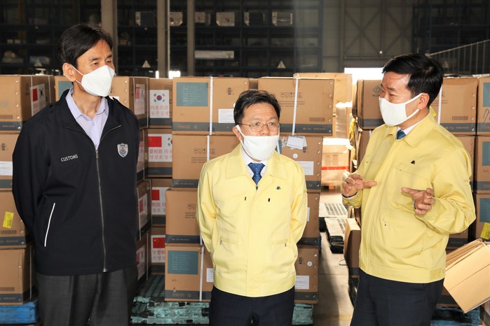 노석환 관세청장은 25일 인천공항 보세창고를 방문해 보건용 마스크, 방호복, 마스크 제조용 부직포(MB) 등 코로나19 예방물품 수입통관 현장을 점검하고 신속통관을 독려했다.