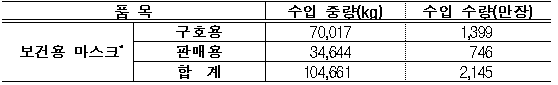 주요 수입 대상국은 중국(66%).베트남(22%).미국(3%) 순이었으며, 유형별로는 보건용이 65%, 의료용이 35%를 차지하는 것으로 나타났다.