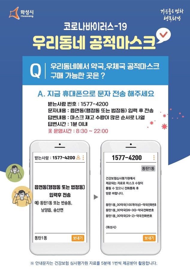 경기 화성시가 오는 23일부터 공적 마스크 재고를 알려주는 자동안내 문자 서비스를 실시한다고 22일 밝혔다.