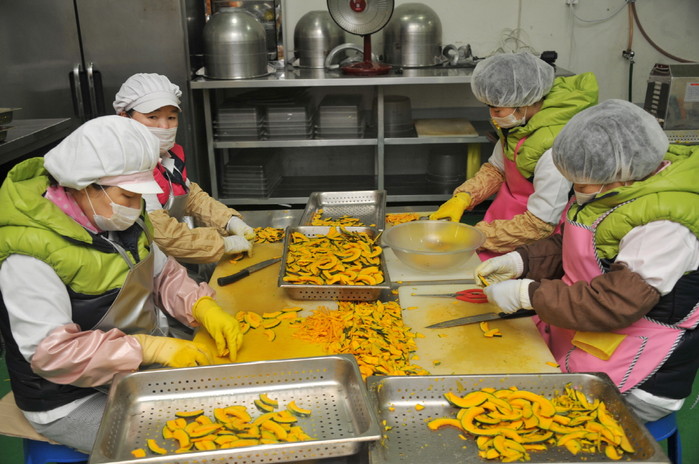 ▲순창군 예비 사회적기업 벼이삭영농조합법인 조합원들이 호박을 다듬고 있다. |