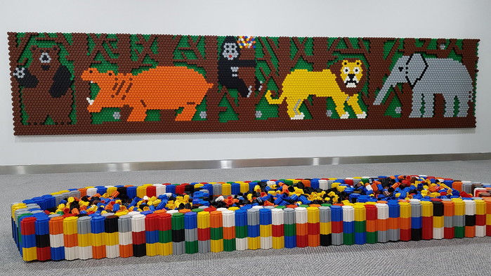 앵무새 케이지, 쇼핑백, 동물의 왕국 등 총 4개 작품이 전시돼 있으며 아이들이 직접 블록놀이를 체험할 수 있도록 총 8개의 색깔 블록이 구비돼 있다.