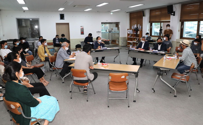| ▲지난 24일 김주수 군수가‘청춘구 행복동’ 프로젝트 참여 청년과 ‘예술가 일촌맺기’ 프로젝트 참여 청년예술가 등 40여 명과 ‘이웃사촌 청년시범마을 청년 소통 간담회’를 진행하고 있다.(의성군 제공) |