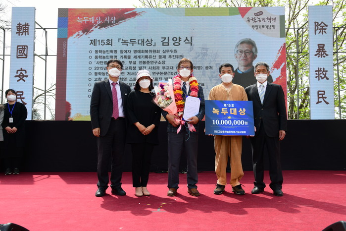 이번 제15회 녹두대상’은 청주대학교 김양식 교수에게 수여됐다‘. 김양식 교수는 2014년부터 동학농민혁명 참여자 명예회복추진위원회 실무위원, 동학농민혁명기록물 세계기록유산 등재 추진위원회 추진위원 등의 활동으로 동학농민혁명의 위상을 높인 공적을 인정받았다.