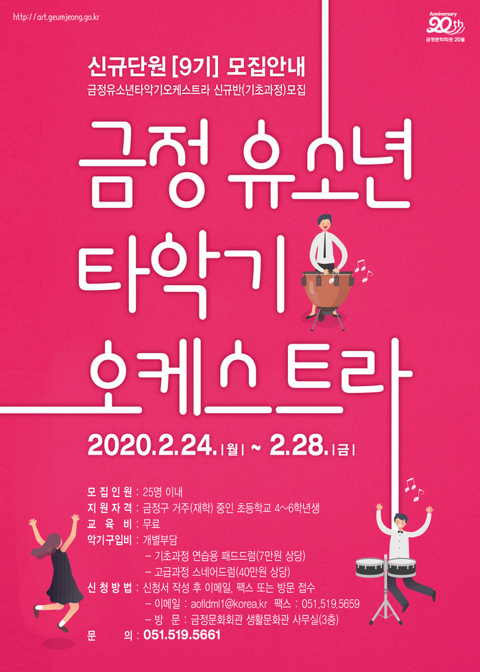 신규단원은 패드드럼을 이용한 기본기부터 개인연주와 합주형식의 앙상블 연습을 단계적으로 배우게 된다. 콰이어혼과 붐웨커를 이용한 새로운 타악기 수업도 준비되어 있다. 숙련된 강사가 함께 하는 9년 전통의 ‘금정유소년타악기오케스트라’ 신규단원 모집에 주목하길 바란다.