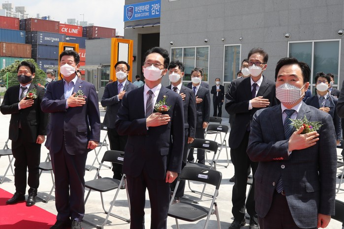임재현 관세청장(왼쪽 세번째)이 부산항 감만부두 컨테이너화물검사센터 개장식에서 국민의례를 하고 있다.(사진=관세청 제공)