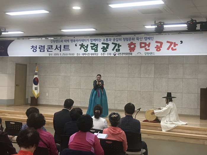 청렴콘서트 ‘청렴공감 휴먼공간’은 국민권익위원회가 일반 시민을 대상으로 지원하는 맞춤형 청렴교육으로 강원랜드가 폐광지역의 발전과 주민생활 향상에 기여하고자 마련했다.