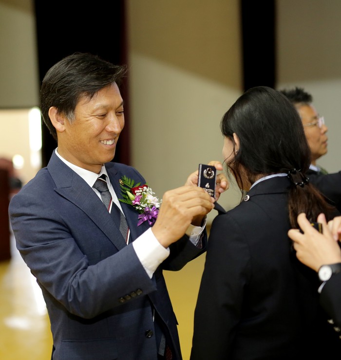 | ▲김영문 관세청장이 수료식을 마친 교육생들에게 계급장을 부착해주고 있다.(관세청 제공) |