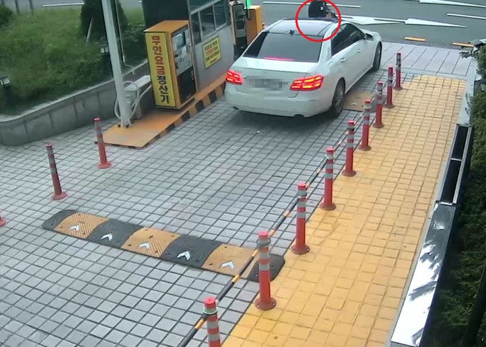 ▲피의자 A씨가 주차장 입구서 출차하는 차량에 뛰어드는 모습.(부산경찰청 제공) |