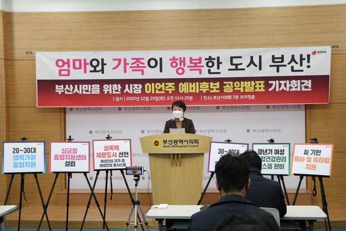 이언주 예비후보는 29일 오전 11시 20분경 부산시의회 브리핑룸에서 기자회견을 열고 “여성의 생애주기에 따른 맞춤형 여성 공약을 준비했다”며 6가지 여성 정책을 발표했다.