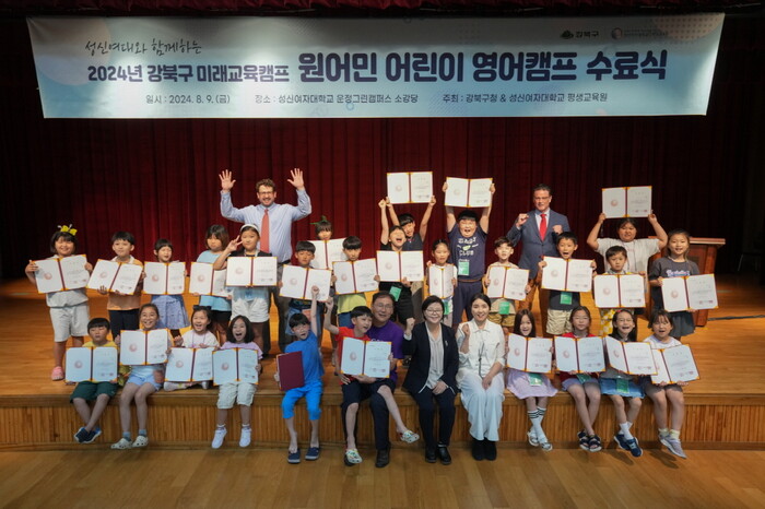 지난 9일 성신여대 미아운정그린캠퍼스 소극장에서 열린 어린이 영어 캠프 수료식에서는 학생들이 영어연극을 하며 10일간 배운 영어 실력을 뽐내 박수를 받았다. 이날 수료식에는 이순희 강북구청장, 이성근 성신여대 총장, 김순정 성신여대 평생교육원장 등이 참석해 학생들을 격려했다.