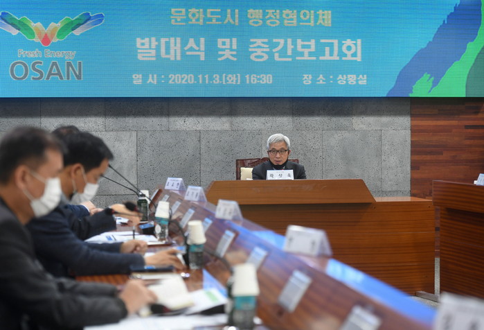 ▲곽상욱 시장이 지난 3일 문화도시 행정협의체 발대식 및 중간보고회를 주재하고 있다. |