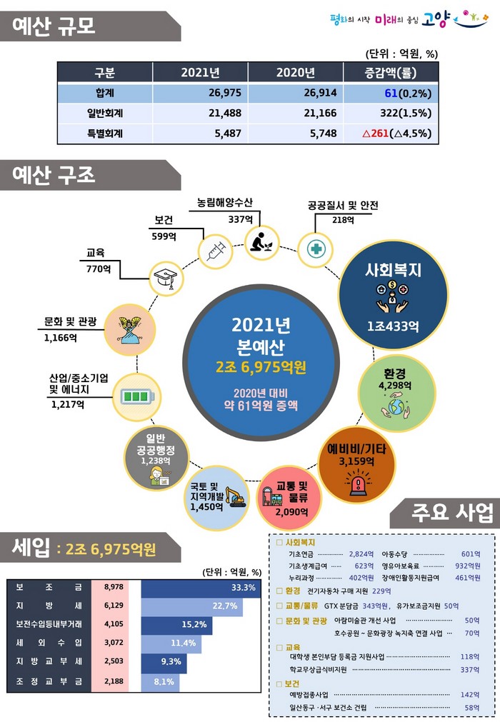 고양시는 코로나19로 경제성장 둔화와 교부세 감소의 어려운 재정 여건에 경상예산을 대폭 삭감하고, 사업구조조정과 신규투자 억제를 통해 재원을 마련해 주민 숙원사업은 최대한 반영하고자 했다. 2021년 주민참여예산은 106억원으로 역대 최대 규모로 편성했다.