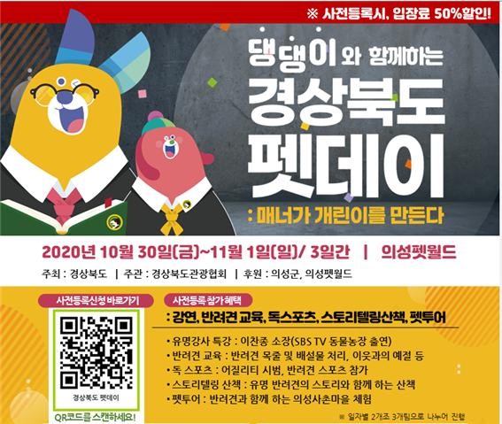 ‘매너가 개린이를 만든다’를 주제로 열리는 이번 행사는 반려견 유명강사(이찬종 소장) 특강, 반려견 교육, 독 스포츠, 스토리텔링 산책, 펫투어 등 반려견과 함께하는 다채로운 프로그램들이 마련됐다. 특히, 메인 이벤트인 펫투어는 반려견을 동반하여 의성 대표 관광지 사촌마을을 둘러보는 이색적인 프로그램으로 반려인들에게 보다 특별한 경험을 선사할 예정이다.