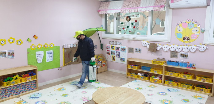 | ▲한 방역관계자가 코로나19 예방을 위해 ‘부영 사랑으로 어린이집’ 원내 소독을 진행하고 있다. |