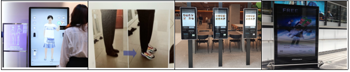 | ▲스마트시범 상가 도입의 예. 왼쪽부터 (스마트미러) 가상으로 스타일링·피팅 등을 체험 1~2번, (키오스크) 주문‧결제 등이 가능한 무인 주문기, (디지털 사이니지) 상점위치, 취급제품 및 지역명소 등 종합 안내.(김포시 제공) |