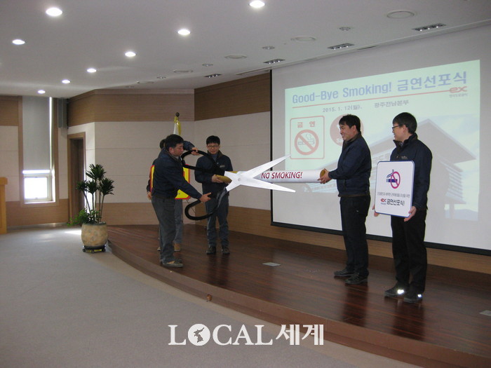 | ▲ 전남 담양군이 ‘찾아가는 금연클리닉’ 캠페인을 벌이고 있는 가운데 한국도로공사를 찾아 가위로 담배를 자르는 퍼포먼스를 연출하고 있다. ©로컬세계 |