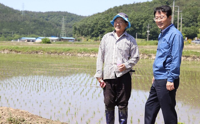 ▲ 모내기 현장 방문 강진원 군수 (사진=강진군 제공) |