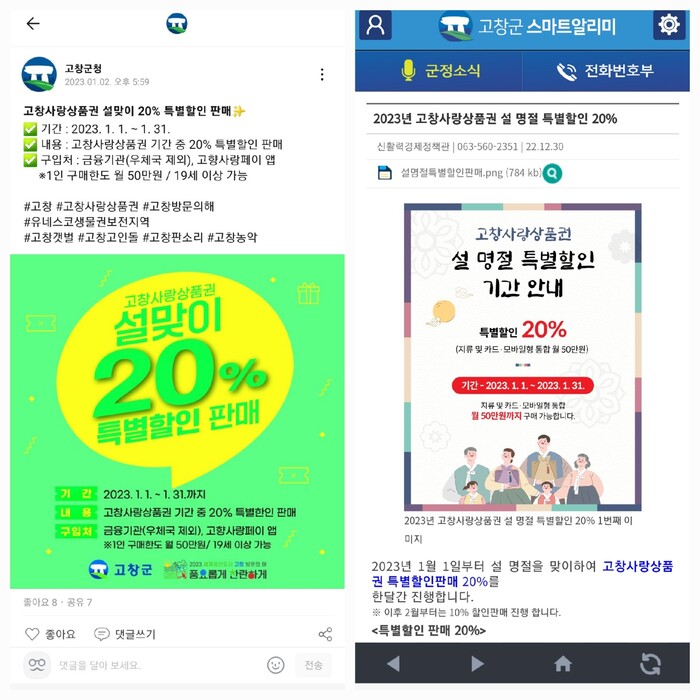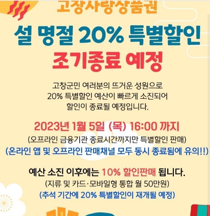 [로컬세계=김경락 기자] 전북 고창군은 '고창사랑상품권 설맞이 20% 특별할인 판매'를 이달 1일부터 말일까지 한 달 동안 판매한다고 마을 방송과 SNS 등을 통해 대대적으로 홍보했다.
