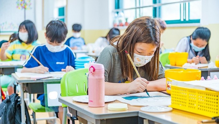| ▲보급한 수업용 키트로 민화를 그리는 학생 모습.(오산시 제공) |