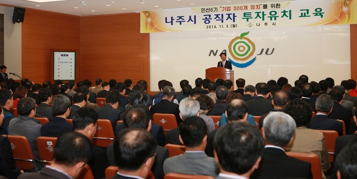 4일 나주시에 따르면 강인규 시장을 비롯한 국소장, 실단과 및 읍면동장, 본청직원 등 200여명이 참여한 가운데 3일 오전 민선6기 ‘기업 300개 유치’ 목표 달성을 위한 1부서 1기업 투자유치 보고회 및 투자유치 교육을 가졌다.