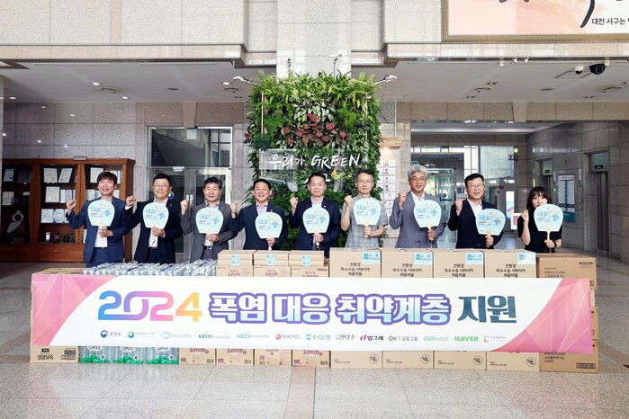 지난 12일 대전 서구청에서 열린 기부물품 전달식을 통해 제주개발공사를 비롯 각 지원기업의 물품은 연일 계속되는 폭염으로 건강을 위협받는 홀몸어르신과 차상위 계층 약 1000여 세대에 전달될 예정이다.