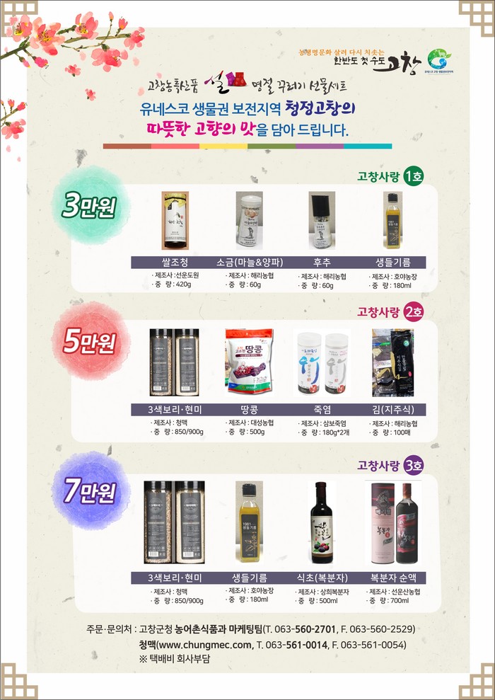 이번 선물세트는 12개 제품(삼색보리, 현미, 들기름, 복분자 식초, 쌀조청, 마늘&양파, 후추, 땅콩, 지주식 김, 죽염, 복분자 순액)을 3, 5, 7만원 가격대별 3종 세트로 꾸며 군민, 재외군민, 공공기관 등 누구나 감사한 마음을 전할 수 있도록 했다.