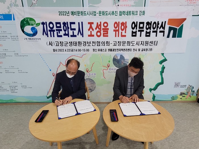 [로컬세계 김경락 기자]전북 고창문화도시지원센터와 고창군생태환경보전협의회가 지난 22일 업무협약식을 갖고 고창의 생태환경자원을 활용한 치유문화도시 조성사업에 적극 협력해 나가기로 약속했다.