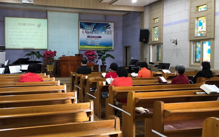 | ▲마스크 착용과 거리두기를 하고 예배를 보고 있는 모습.(화성시 제공) |