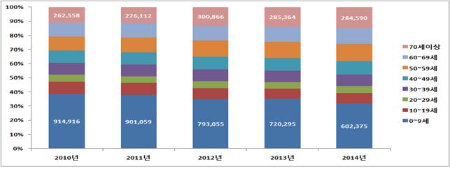 ▲천식 연령구간별 진료인원 및 비중(2010년-2014년). ©로컬세계 |