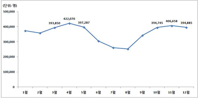 ▲천식 월별 진료인원(2010년-2014년 평균). ©로컬세계 |