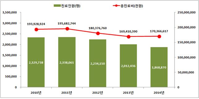 비용도 덩달아 줄었다. 2014년 진료비용은 1704억원으로 2010년 1939억원에 비해 236억원(-12.1%)이 감소했다.