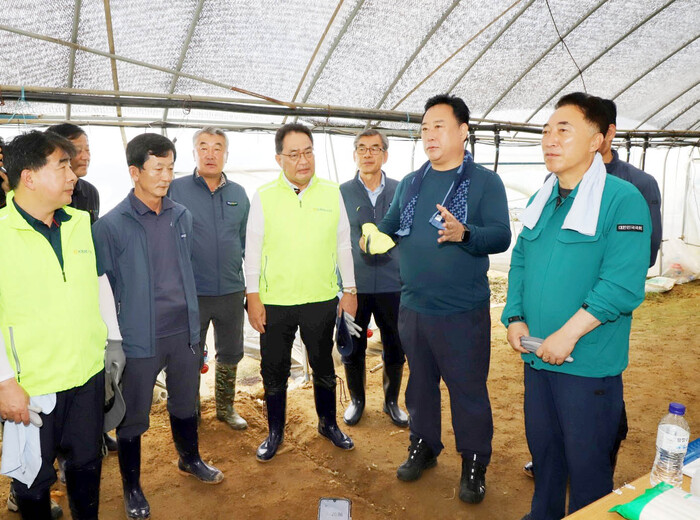 ▲(사진 앞줄 오른쪽부터) 박수현 의원(지역구:충남 공주시부여군청양군), 어기구 농해수위 위원장(지역구:충남 당진시), 지준섭 농협중앙회 부회장이 충남 부여군의 농가를 방문하여 집중호우로 인한 피해상황 점검과 향후 복구 및 지원계획을 논의하고 있다. 농협 제공 |