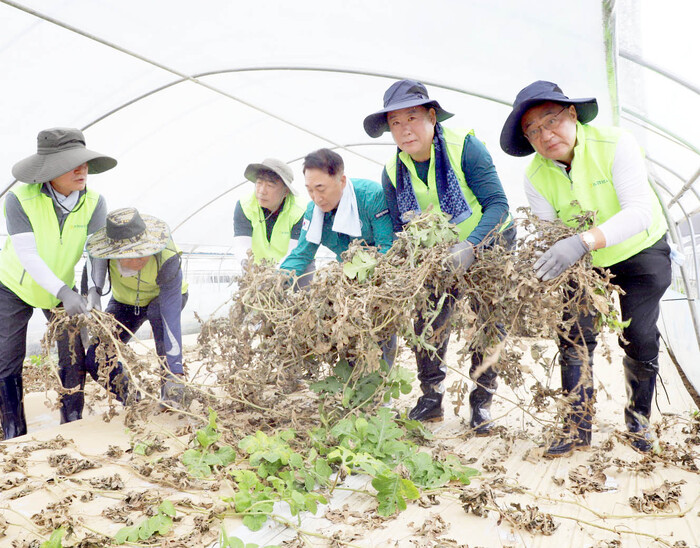 ▲ (사진 오른쪽부터) 지준섭 농협 부회장, 어기구 농해수위 위원장(지역구: 충남 당진시), 박수현 의원(지역구: 충남 공주시부여군청양군), 백남성 농협 충남세종본부장 등 범농협 임직원들이 15일 충남 부여군의 농가를 방문하여 수해피해 농산물 수거 및 폐기작업을 돕고 있다. |