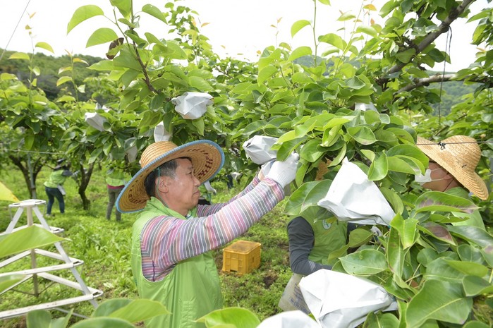 | ▲2일 경기도 파주시 금곡마을에서 농협유통 정연태 대표이사와 임직원 20여 명이 배나무 열매솎기 작업을 하고 있다.(농협유통 제공) |