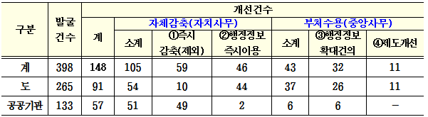 | ▲총 398건 발굴, 148건 개선(105건 자체감축, 43건 부처수용 (2020.1.17. 기준, 단위 : 서류 건수) |
