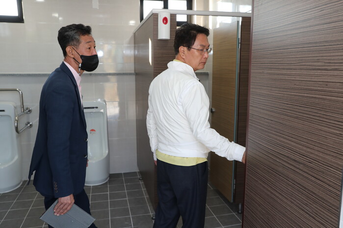 ▲심덕섭 군수가 캠핑장 화장실을 점검하고 있다. 고창군 제공 |