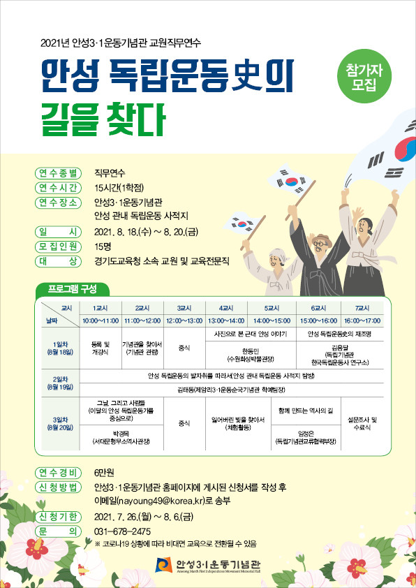 연수대상은 경기도 교육청 소속 교원 및 교육전문직으로 총 15명을 모집하며, 신청은 안성3.1운동기념관 홈페이지에 게시된 신청서를 작성하여 담당자 이메일로 제출하면 된다.