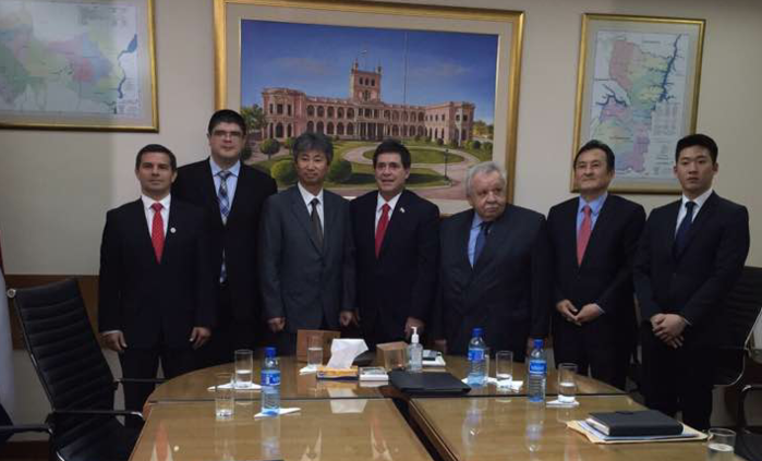 | ▲파라과이 대통령궁에서 오라시오 대통령(가운데)과 ESSCOM JAPAN 김진배 이사(오른쪽 두 번째) 등이 ESS시스템 도입절차에 대한 회의를 마친 뒤 기념사진을 찍고 있다. |