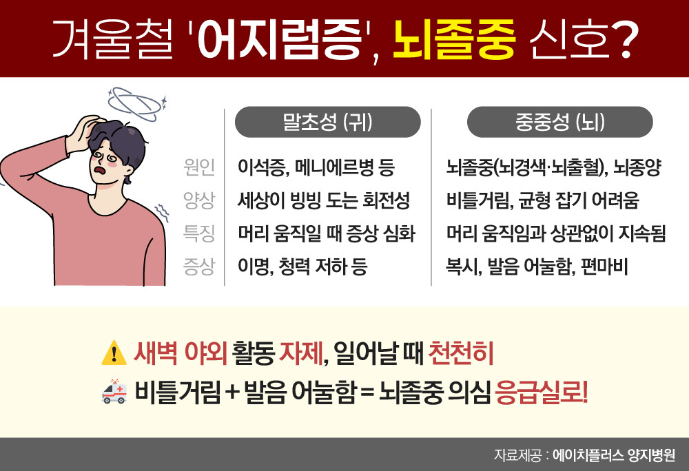 에이치플러스 양지병원 신경과 류창환 전문의는 “급성 어지럼증으로 응급실을 찾는 환자 상당수는 말초성이 원인이지만, 약 10~25%는 뇌혈관 문제를 포함한 중추성 어지럼증에 해당한다”며 “고령층이나 고혈압·당뇨· 이상지질혈증 등 기저질환이 있는 경우, 겨울철 어지럼증은 뇌경색이나 뇌출혈의 전조증상일 수 있다는 점을 반드시 고려해야 한다”고 설명했다.