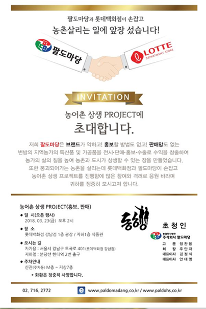 '농어촌상생프로젝트'는 롯데백화점과의 전략적인 파트너십을 통해 강소농민 및 직접 생산자들의 농특산품의 안정적인 판로지원은 물론, 지속 가능한 판매전을 운영함으로써 농촌을 살리는데 앞장서기 위해 팔도마당이 마련한 전략 프로그램이다.